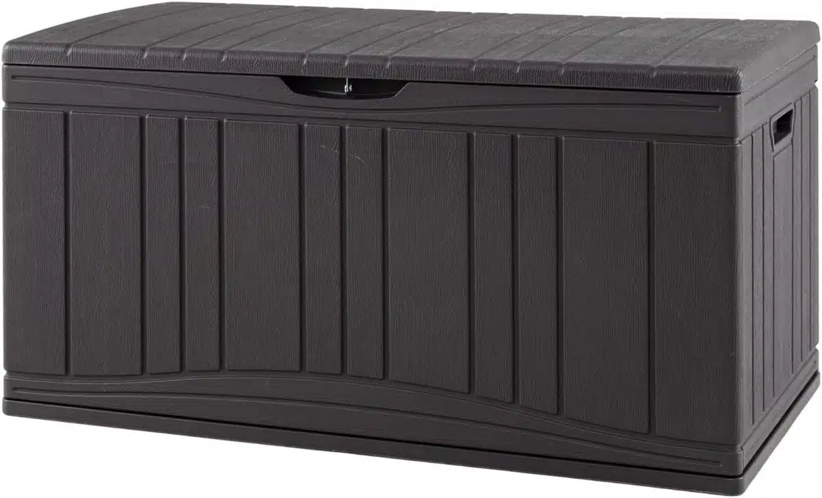 Het materiaal is onderhoudsarm en bestand tegen regen en zonlicht. Hierdoor hoef je niet constant te controleren of spullen droog en schoon blijven. De stevige constructie houdt vocht en vuil buiten en verlengt de levensduur van je opbergspullen. Daarbij blijft de doos eenvoudig te openen en te sluiten zodat je altijd snel bij wat je nodig hebt.