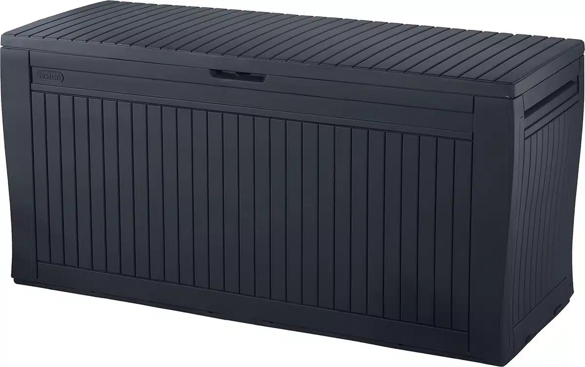 Productspecificaties: Merk: Koll Living Kleur: Antraciet Materiaal: Kunststof Opslagcapaciteit: 270L Buitenafmetingen: 116,7 x 44,7 x 57 cm (L x B x H) Binnenafmetingen: 114,4 x 40 x 51,2 cm (L x B x H) Type sluiting: Scharnierend deksel met vergrendeling Vorm: Rechthoekig Draagvermogen: 250 kg