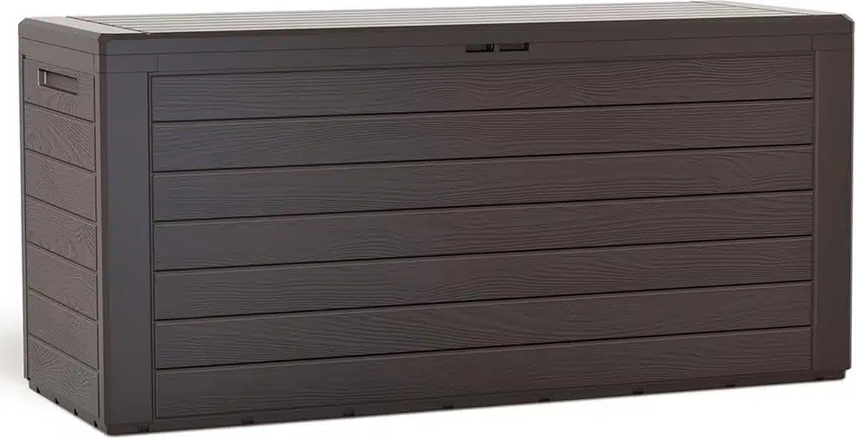 Dankzij de drie geรฏntegreerde handvatten kun je deze opbergbox gemakkelijk verplaatsen, zelfs als hij vol zit. Het elegante patroon in houten rand zorgt ervoor dat de box niet alleen praktisch is, maar ook een moderne uitstraling aan je tuin geeft.