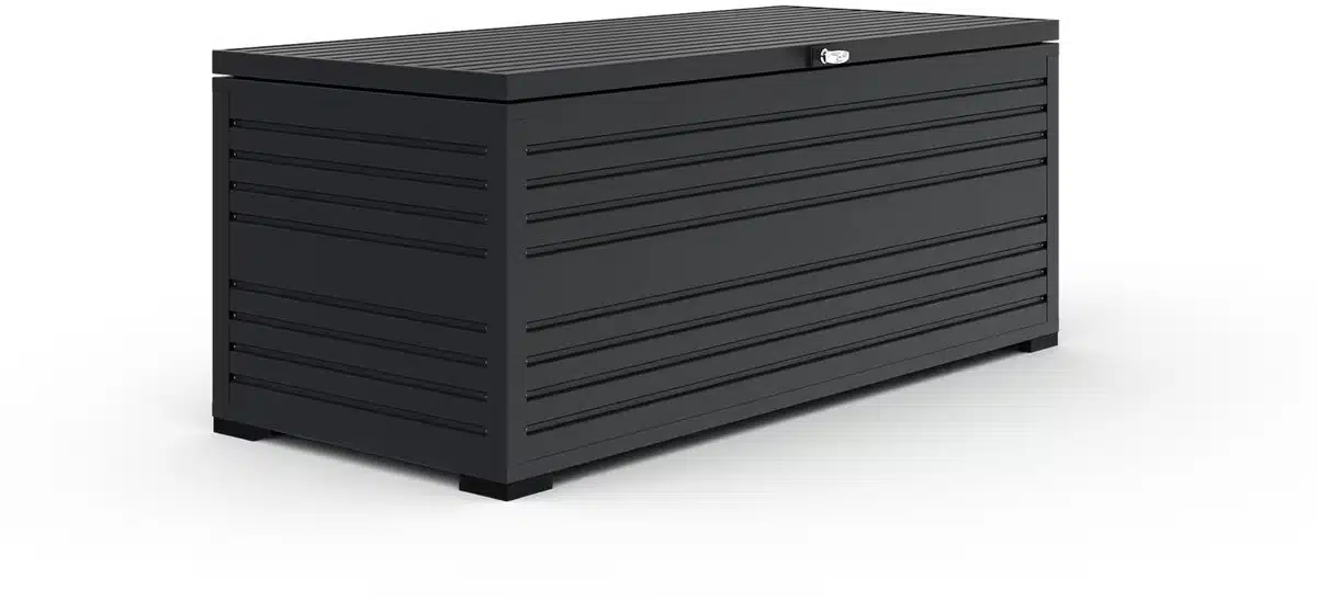 Orion Sit & Store – Aluminium opbergbox – 1050L – Antraciet De Orion Sit & Store is dรฉ robuuste en stijlvolle oplossing voor al uw opbergwensen in de tuin of op uw terras. Of u nu tuinkussens, gereedschap of andere accessoires wilt opbergen, deze opbergbox biedt een ruime en onderhoudsarme opslagoplossing die jarenlang meegaat. Daarnaast is deze opbergbox voorzien van gasveren die de deksel automatisch voor u openhouden. Tevens beschikt deze opbergbox over een geรฏntegreerd slot met 2 sleutels.