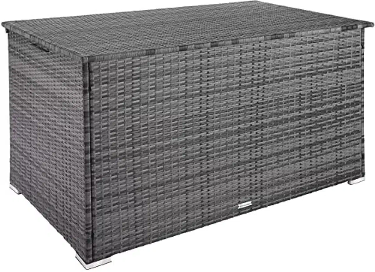 De buitenzijde is afgewerkt met een weerbestendige wicker laag die de inhoud beschermt tegen regen en zonlicht. Het materiaal heeft een moderne grijze kleur die zich moeiteloos voegt naar uiteenlopende tuinmeubelen en terrasstijlen. De stevige constructie behoudt vorm en stabiliteit tijdens dagelijks gebruik, ook bij wisselend weer.
