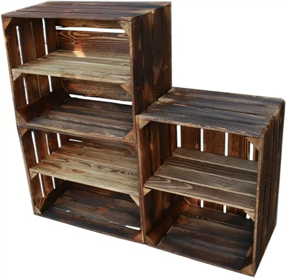Deze set is ideaal voor wie zoekt naar een combinatie van sfeer en orde zonder opvallende merkaanduidingen. De donkere kleur werkt als subtiele eyecatcher en geeft een warme basis voor accessoires en textiel. Of je nu opbergt om op te ruimen of om spullen overzichtelijk te presenteren, deze gevlamde houten kisten vormen een stijlvolle en praktische aanvulling op elke ruimte.