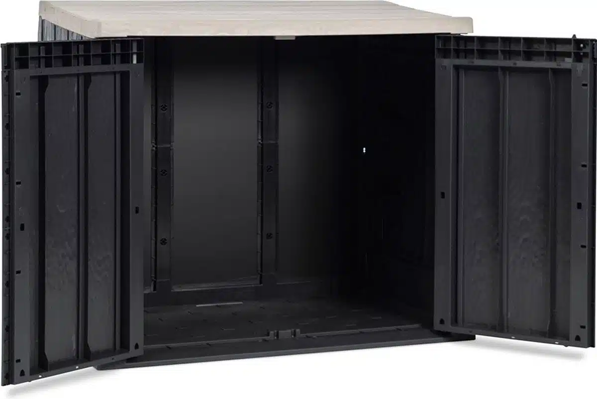 Toomax Stora Way opbergbox – 2270L – donkergrijs/antraciet De Toomax Stora Way opbergbox is de perfecte oplossing voor het opbergen van kussens, tuinaccessoires en prullenbakken in je tuin of op je terras. Deze stijlvolle en functionele opbergbox biedt een combinatie van gebruiksgemak, duurzaamheid en een aantrekkelijk ontwerp. Deze box kan open via de twee deurtjes maar ook door de klapdeksel. Door het grote volume is er genoeg plek voor het opbergen van tuinkussens of verschillende soorten tuingereedschap. De opbergbox beschikt over een hangslotvoorziening zodat je de box volledig kan afsluiten. (hangslot niet meegeleverd).