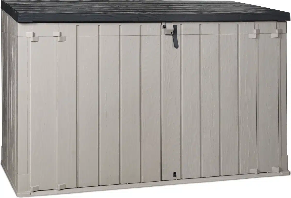 Toomax Stora Way opbergbox – 2770L – lichtgrijs/antraciet De Toomax Stora Way opbergbox is de perfecte oplossing voor het opbergen van kussens, tuinaccessoires en prullenbakken in je tuin of op je terras. Deze stijlvolle en functionele opbergbox biedt een combinatie van gebruiksgemak, duurzaamheid en een aantrekkelijk ontwerp. Deze box kan open via de twee deurtjes maar ook door de klapdeksel. Door het grote volume is er genoeg plek voor het opbergen vaneen fiets of verschillende soorten tuingereedschap, maar ook voor twee 360L en รฉรฉn 240L containers. De opbergbox beschikt over een hangslotvoorziening zodat je de box volledig kan afsluiten. (hangslot niet meegeleverd).