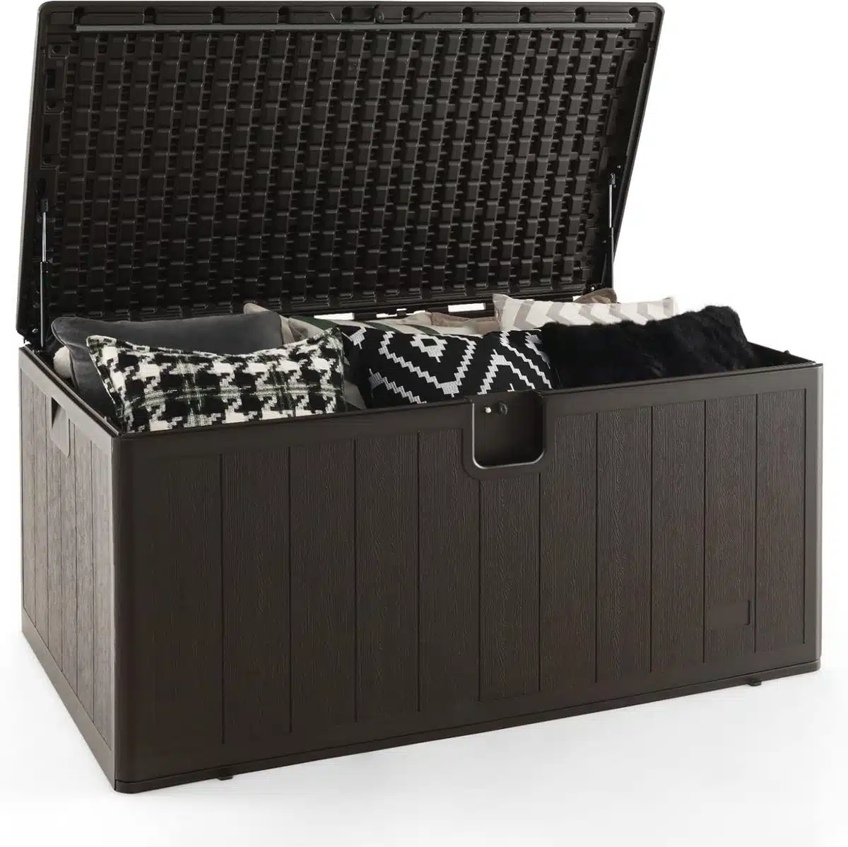 De deksel is gemakkelijk te openen en te sluiten, waardoor spullen snel bereikbaar blijven. Het ruime volume biedt voldoende ruimte voor tuingereedschap, tuinmateriaal en seizoensopslag. Doordat het model geen merklogo draagt oogt het rustig en neutraal, hetgeen zorgt voor flexibiliteit bij plaatsing naast tuinmeubelen of bij een schuur.