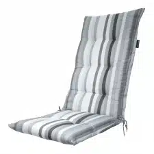 Zoek je een tuinstoelkussen voor stoelen met een hoge rug? Dit kussen is er prima voor geschikt.Het dessin van het kussen is grijs van kleur.De grootte van het zitgedeelte is ca. 45x47cm en de totale afmeting is ca. 118x47cm.De zitting is ca. 7cm dik.Je kunt Tuinkussen hoge rug – Righe grey met band en touwtjes vastmaken aan jouw tuinstoel.Merk kussen: Madison kussens.