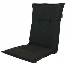 Ben je op zoek naar een tuinkussen voor een vaste stoel?Hoofdkleur van het tuinkussen: zwartDe totale lengte en breedte van het kussen is ca. 106x46cm. De maat van de zitting is ca. 46x46cm.Zitting en rug van het kussen hebben een dikte van ca. 6cm.Je kunt het lage rug kussen vastmaken aan de stoel middels een band en touwtjesDit lage rug kussen komt uit de collectie van Madison kussens