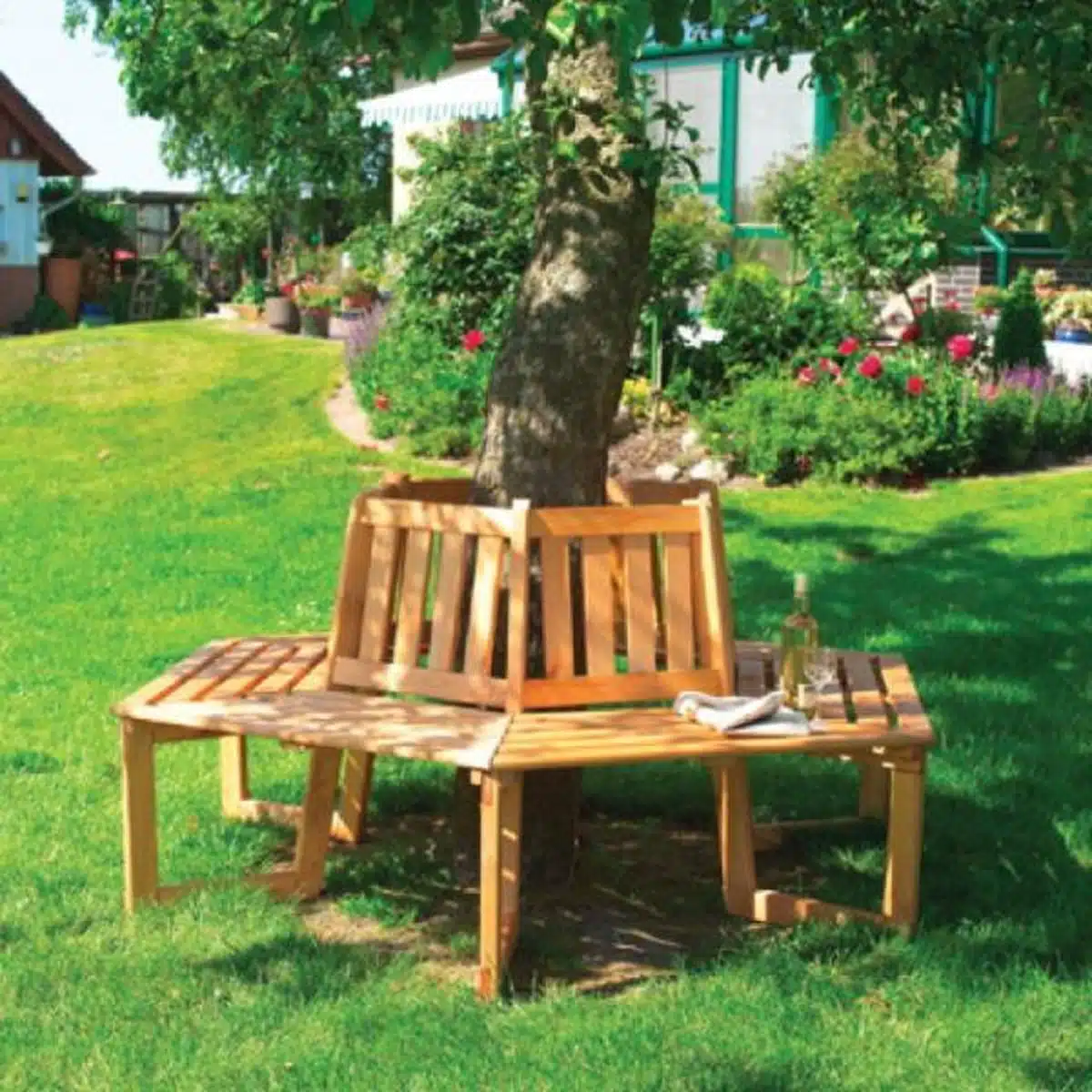 Plaatsing rond een boomstronk of jonge stam gaat snel en zorgt direct voor extra zitruimte zonder de wortels te belasten. De zitting is royaal bemeten en biedt comfortabel plaats aan vrienden of familie tijdens een tuinborrel of rustige middag. Door de symmetrische vorm ontstaat een sociale sfeer waarin iedereen elkaar gemakkelijk kan bereiken en conversaties natuurlijk verlopen.