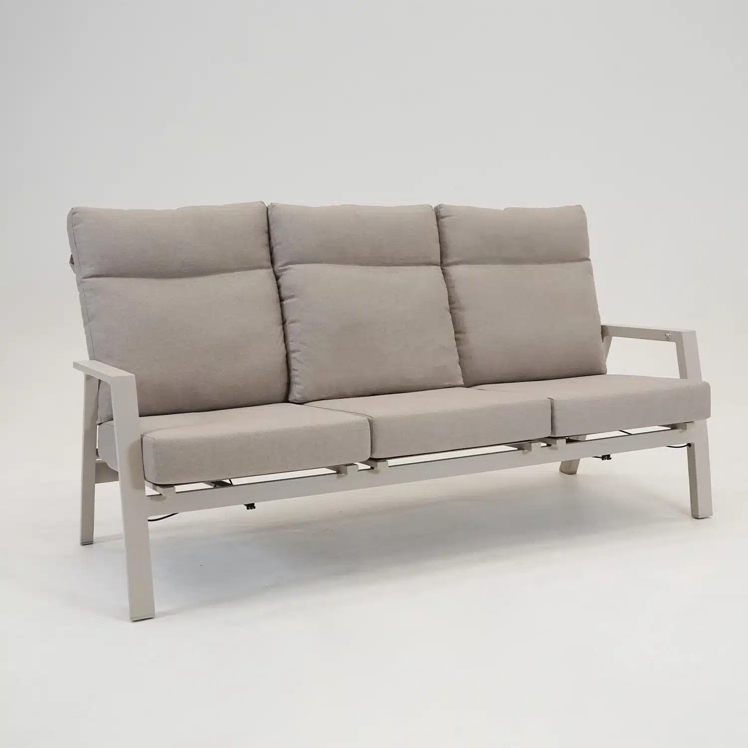 Het frame is vervaardigd uit hoogwaardige materialen die bestand zijn tegen wisselende weersomstandigheden. De beweegbare kussens zijn ruim bemeten en voorzien van een zachte vulling die lang zijn veerkracht behoudt. De hoes is gemaakt van waterafstotend textiel dat eenvoudig schoon te houden is, zodat onderhoud minimaal blijft en de bank er langer als nieuw uitziet.