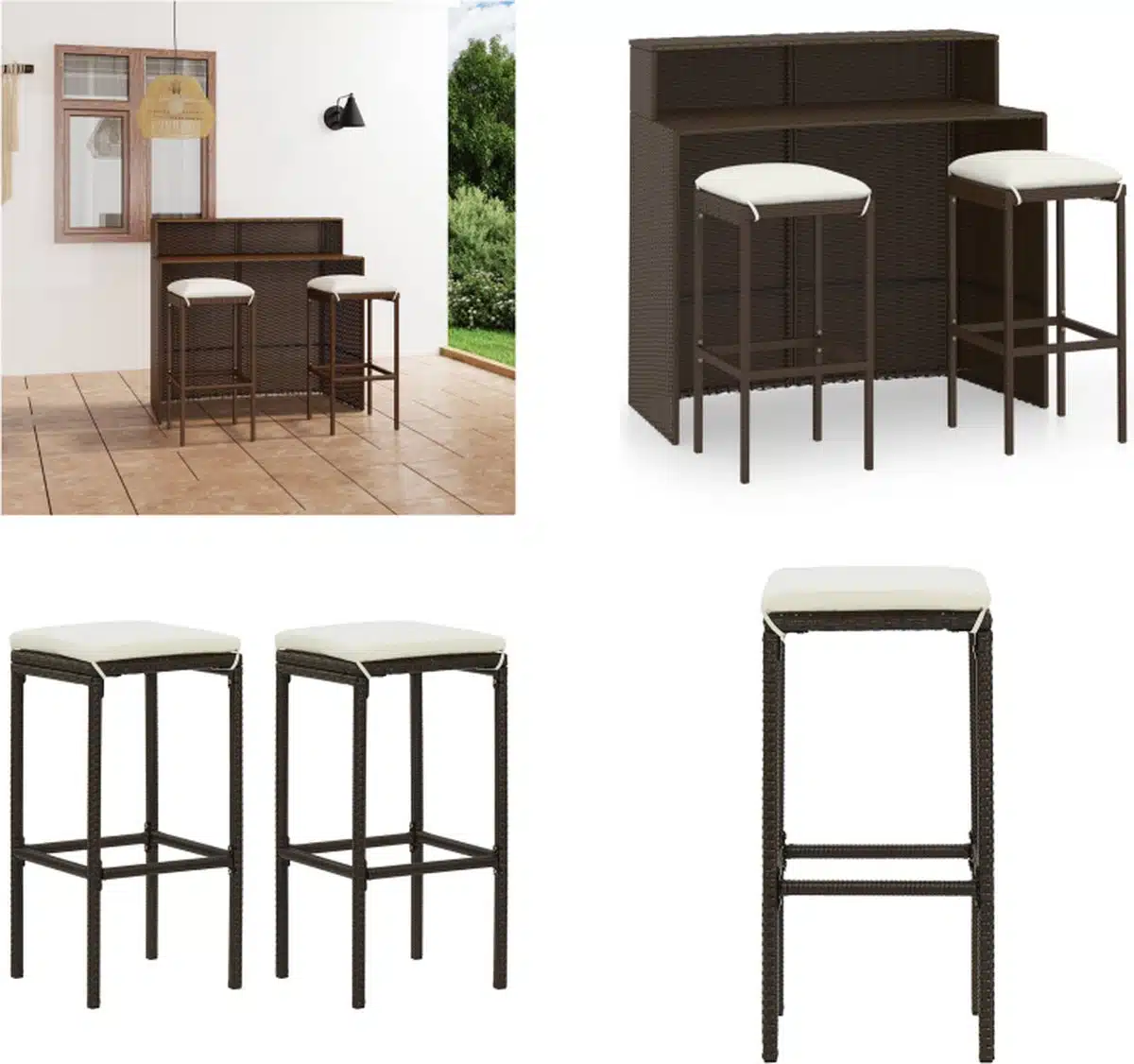 Gebruik de barset als compacte eetplek voor ontbijt in de ochtend zon als ontspannen cocktailhoek bij zonsondergang of als praktische werkplek in de buitenlucht. De combinatie van stevigheid en comfort maakt de set veelzijdig inzetbaar. Kies deze bruine barset om een knusse sfeer te creรซren in uw tuin of op uw terras. Met de vidaXL kwaliteit haalt u een functioneel en stijlvol meubel in huis dat lang meegaat.