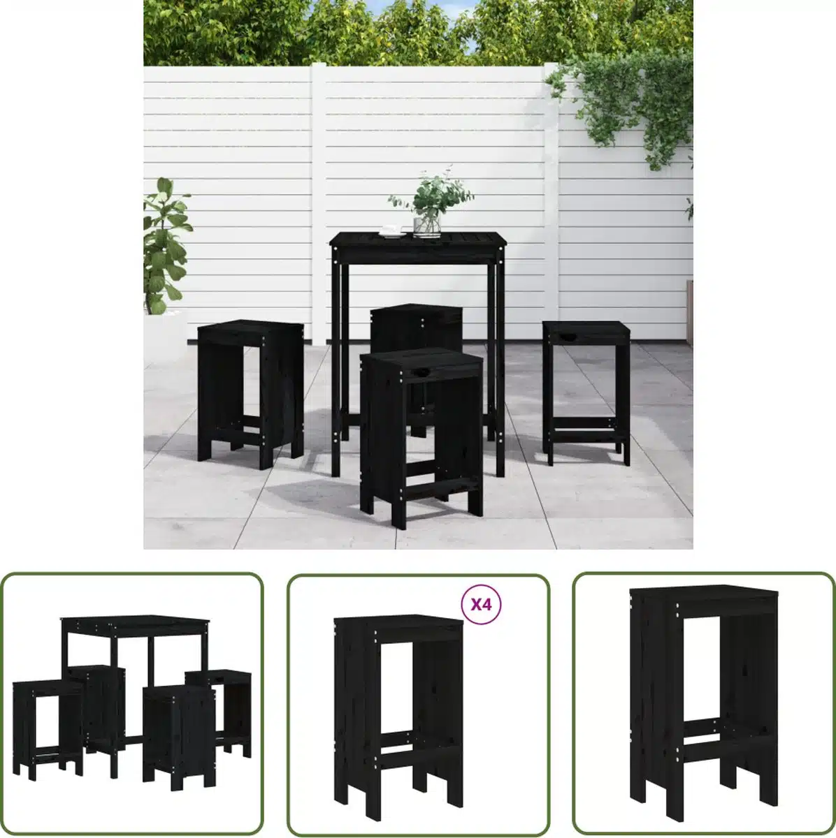 Deze vijfdelige vidaXL tuinbarset in zwart is ontworpen voor wie compact comfort en een moderne uitstraling zoekt. De set bestaat uit een bartafel en vier bijpassende krukken en vormt een stijlvolle eetplek op terras of in de tuin. Dankzij het strakke silhouet neemt de opstelling weinig ruimte in beslag en past zij moeiteloos bij uiteenlopende buiteninrichtingen.
