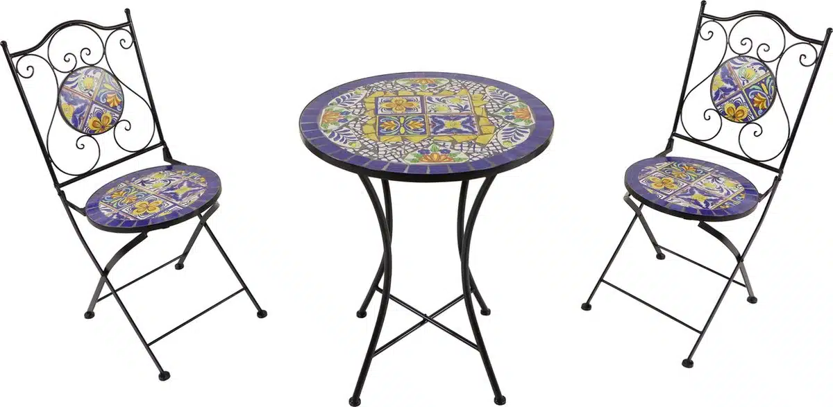 Prachtige AXI Amélie 3 delige mozaïek bistroset in blauw en geel. Het mediterrane mozaïekpatroon geeft veel sfeer en maakt ons balkon direct gezelliger. De set is stevig en comfortabel en een echte aanrader!