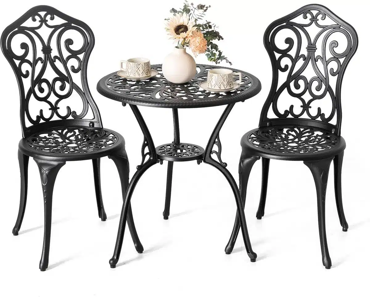 Ontdek de bistroset tuinmeubelen 3-delig, een compacte en elegante oplossing voor balkon of terras. Het ontwerp is minimalistisch en modern, uitgevoerd in tijdloos zwart, zonder merknaam. Deze set bestaat uit een gegoten aluminium terrastafel met stevig frame en twee bijpassende stoelen, perfect afgestemd op kleine buitenruimtes vol sfeer.