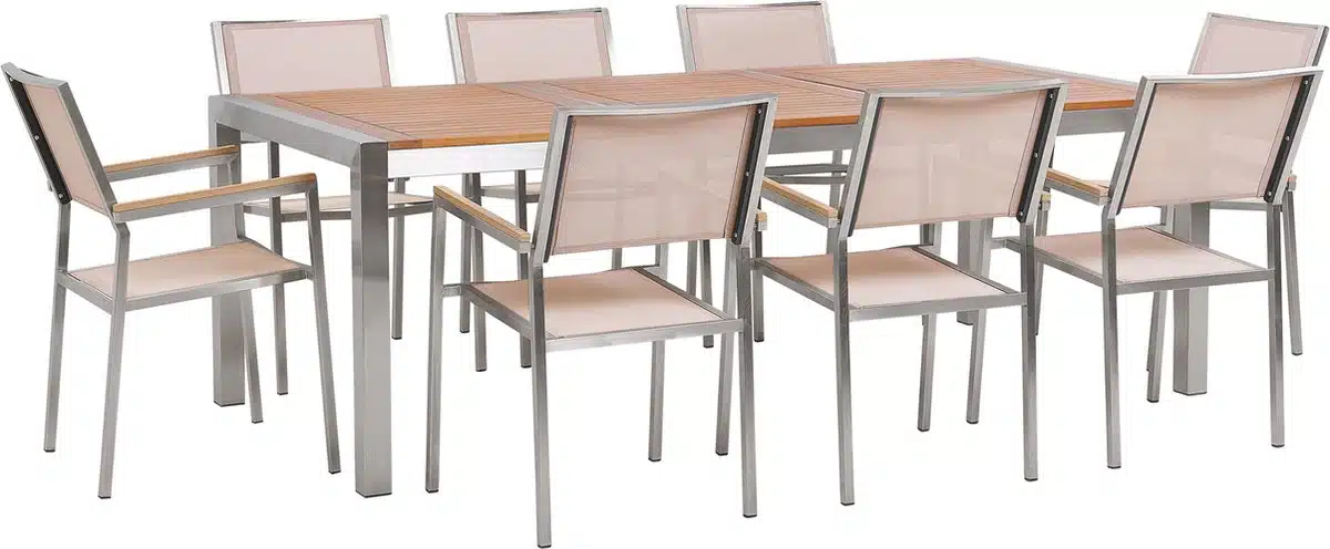 BELIANI GROSSETO – Tuinset voor acht personen combineert strak design met doordachte functionaliteit. Deze set is ontworpen voor lange avonden en ontspannen bijeenkomsten. Het tijdloze beige brengt warmte en sfeer in elke tuin of op het terras.
