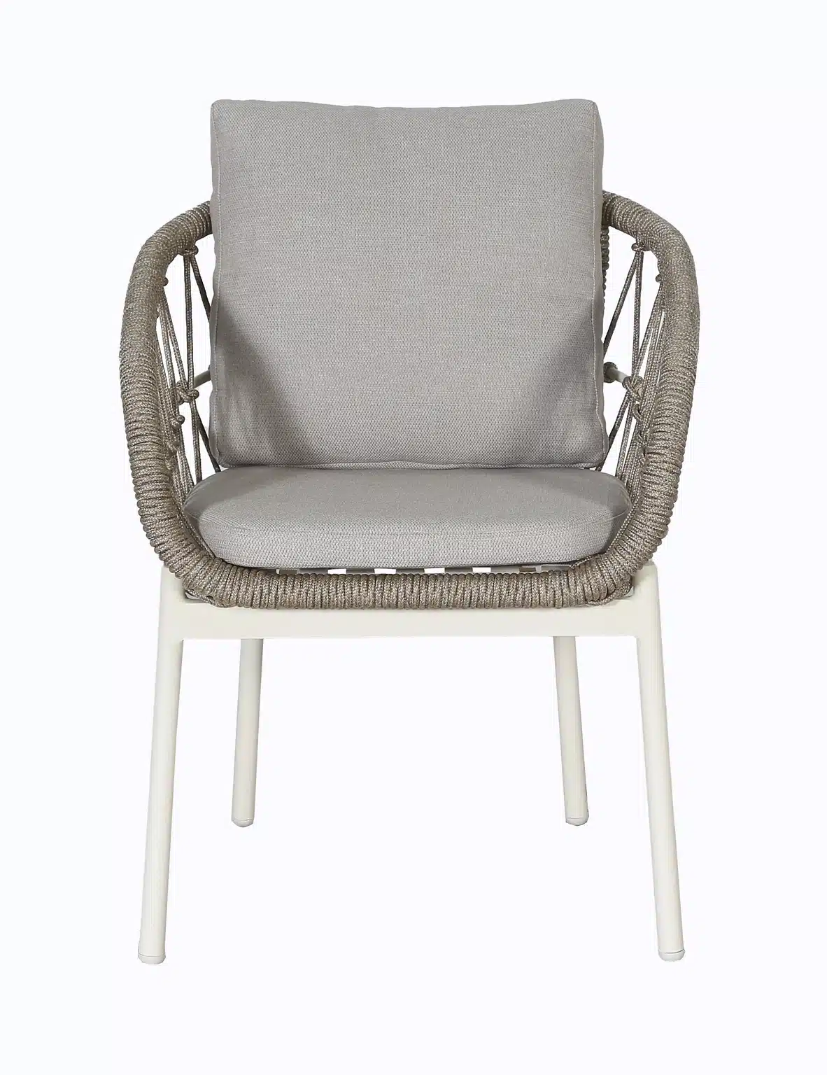 Fijne tuinstoel met een verzorgde uitstraling. De bruine touwbespanning maakt het geheel warm en uitnodigend, terwijl het aluminium frame licht en stabiel blijft. Onderhoudsvriendelijk en geschikt voor verschillende weersomstandigheden. Zitcomfort is verrassend goed tijdens lange avonden buiten.