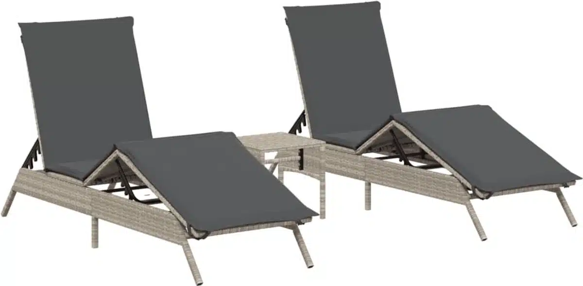Deze set bestaat uit twee stijlvolle ligbedden met een praktische tussenligger die als tafel fungeert. Het tijdloze grijze polymeer ontwerp zonder merk maakt de combinatie neutraal en makkelijk te combineren met uw buiteninrichting. De lichte constructie van het frame maakt verplaatsen en opbergen moeiteloos.