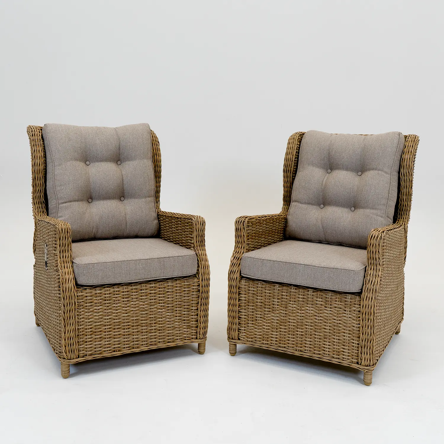 Het frame is stevig en biedt een betrouwbare basis voor langdurig gebruik. De stoel is omvlochten met weerbestendig rattan dat ontworpen is om bestand te zijn tegen vocht en zonlicht. Hierdoor blijft de look behouden zonder snel te verschralen. De zitting is voorzien van zacht gevulde kussens die de rug en het lichaam ondersteunen tijdens langere periodes zitten.