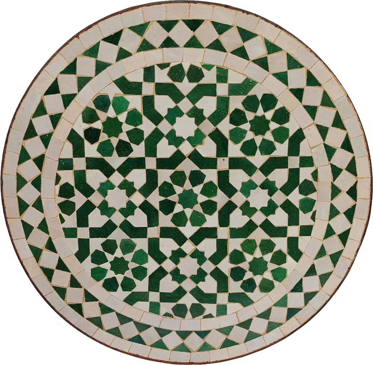 Deze mozaïek bijzettafel Ø45 cm in groen en wit met geglazuurd tafelblad brengt kleur en karakter naar buiten en binnen. Het compacte ronde model past moeiteloos op het balkon het terras of naast een bank. Het geglazuurde oppervlak zorgt voor een subtiele glans en extra diepte die het tafeltje laat opvallen zonder te overheersen.