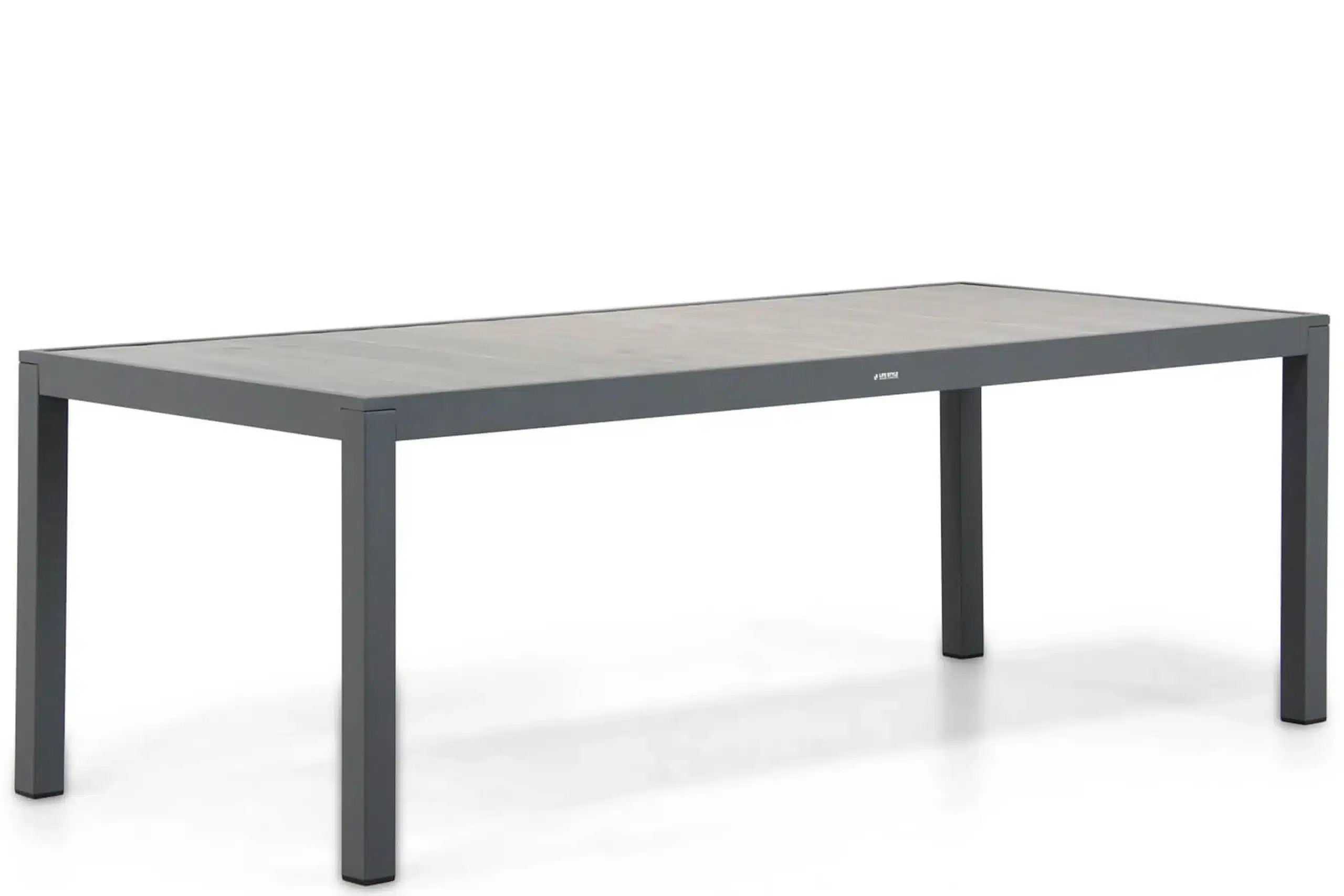 Lifestyle Residence dining tuintafel 220 x 94 cm De stijlvolle Lifestyle Residence tuintafel is een mooie tuintafel die plaats biedt aan wel 4 tot 6 personen. De tuintafel is ingelegd met tegels, deze hebben een uniek houtpatroon waardoor de tuintafel een gezellige maar ook moderne uitstraling heeft. De tuintafel is te combineren met alle tuinstoelen uit het ruime assortiment van Tuinmeubelshop en staat mooi op een modern terras. Eigenschappen Lifestyle Residence dining tuintafel 220 x 94 cm Het onderstel van de Lifestyle Residence dining tuintafel bestaat uit een aluminium frame, deze is tijdens het productieproces door middel van hitte gepoedercoat zodat deze een goede en duurzame beschermlaag heeft. Dit zorgt ervoor dat de tafel niet kan gaat roesten en